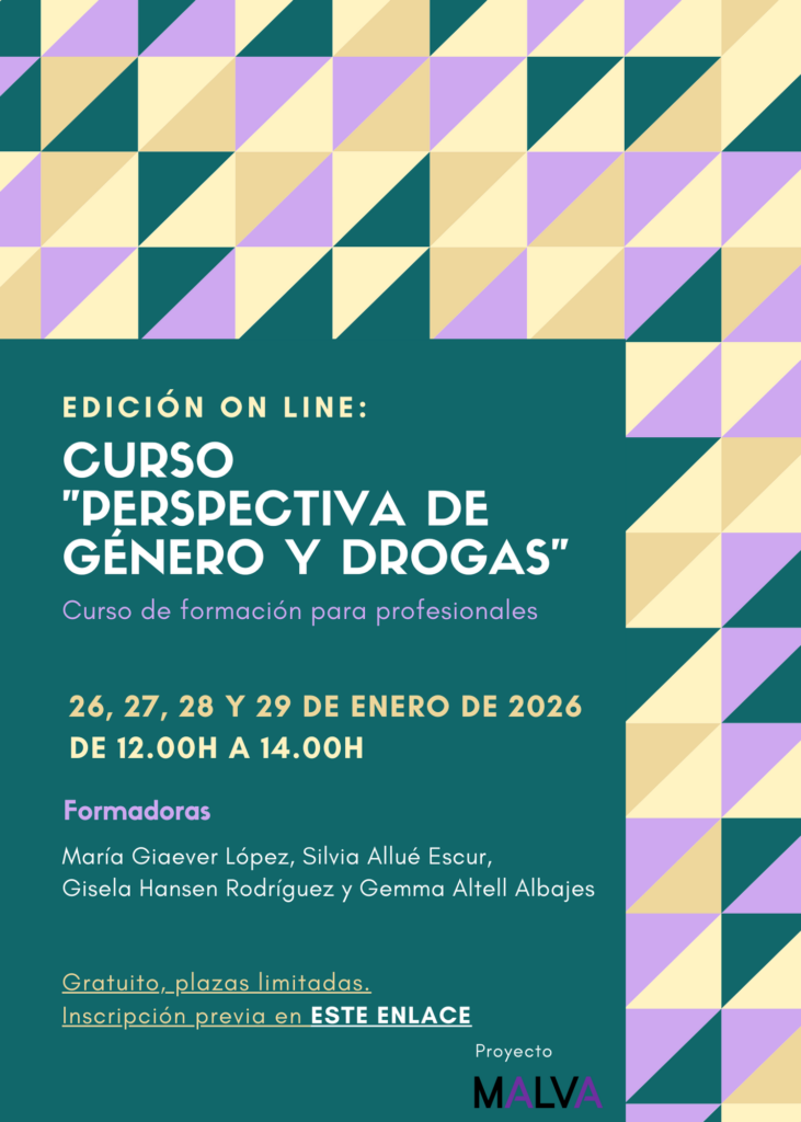 Desde el Proyecto Malva de Fundación Salud y Comunidad os invitamos a esta nueva edición del curso de formación para profesionales “Perspectiva de género y drogas“, en esta ocasión en formato on line. Tenéis toda la información en ESTE PDF. Igualmente, os facilitamos aquí los datos del curso: